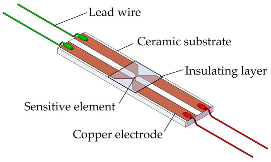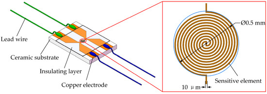 A manganin thin film ultra-high pressure sensor based on MEMS technology for measuring the detonation pressure of microscale charge was designed as depicted in Figure 2. The sensor employs a sandwich structure: 96% alumina ceramics of 0.5 mm in thickness was used as the substrate because of its good adhesion with manganin thin film, chemical corrosion resistance and excellent electrical insulation under high pressure; the sensitive element was made of manganin alloy with a straight strip type, two copper electrodes were extracted at each end of the sensitive element; the insulating layer adopted polyimide of 25 μm in thickness whose impedance matches with that of explosives [19].