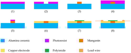 In order to realize the miniaturization of the sensitive element, MEMS technology was employed. Specific fabrication process is illustrated in Figure 3: (1) photoresist was coated on the clean substrate by using a coater; (2) the pattern of the sensitive element on the mask plate was transferred to the substrate by lithography and development; (3) the manganin sensitive element was formed by magnetron sputtering, and then the heat treatment of 300 ℃ for one hour was carried out to increase piezoresistance coefficient of the manganin sensitive element; (4)−(6) the same procedures were implemented to form copper electrodes; (7) the polyimide was affixed to the sensitive element; (8) the lead wires were welded to the ends of four copper electrodes. The physical diagram of the sensor is shown in Figure 4.