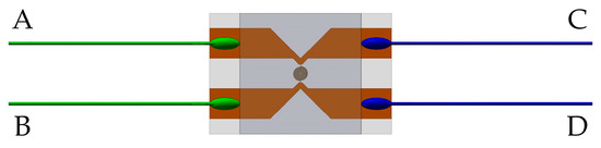 It can be seen from Equation (6) that piezoresistance coefficient is relative change rate of resistance of the sensitive element under pressure. In order to obtain well measurable resistance changes under small pressure, a larger initial resistance of the sensitive element is better. From the microcosmic viewpoint, the relative change rate of resistance of manganin is related to the Fermi energy of electrons and the spin of manganese ions [9]. In other words, piezoresistance coefficients of the same batch of manganin sensitive elements are consistent in theory no matter what their shapes look like. Therefore, the spiral sensitive element manufactured by MEMS technology is employed to increase the resistance, as shown in Figure 5. It is in a circle of 0.5 mm in diameter and has a minimum line width of 10 μm. Its thickness, which is identical with that of the same batch of sensors for dynamic measurement, is 2 μm. Then we can know that the aspect ratio of the spiral sensitive element is 0.4%. The resistance of the spiral sensitive element is determined by standard four-terminal resistance measurement technique. As shown in Figure 6, RAB, RAC, RCD and RBD were measured by using a digital multimeter (type FLUKE 8845A). Thus, we can figure out the resistance of the spiral sensitive element through the following equation: