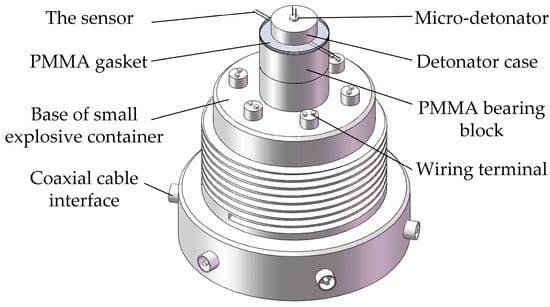 The dynamic testing system includes digital storage oscilloscope (type TDS-2014B), high speed synchronous pulse constant current source (type MH4E) and small explosive container, as illustrated in Figure 8. In the small explosive container, as shown in Figure 9, the PMMA bearing block was pasted on the base of small explosive container with cyanoacrylate glue; the sensor was inserted between the PMMA gasket and the PMMA bearing block using epoxy resin adhesive; the micro-detonator was placed above the PMMA gasket through the case; the center of PMMA bearing block, sensitive element of the sensor, PMMA gasket and micro-detonator were consciously aligned to ensure the measurement accuracy. The input end of the sensor was welded with a wiring terminal, and the corresponding coaxial cable interface was connected with constant current output terminal of the constant current source through a coaxial cable. The same method was used to attach the output end of the sensor to the digital storage oscilloscope. Similarly, the fuses of micro-detonator were linked to synchronous trigger terminal of the constant current source. The shell and base of small explosive container were in threaded connection.
