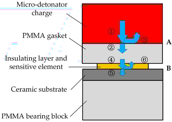 The reflection of detonation wave is shaped when it propagates between different materials. As Figure 10 shows, there are two reflection interfaces from the generation of detonation wave to the resistance changes of the sensitive element caused by detonation wave. It should be noted that the insulating layer and sensitive element can be ignored because of their micron-level thickness. “A” stands for the interface between micro-detonator charge and PMMA gasket, and “B” represents the interface between PMMA gasket and ceramic substrate. In order to calculate the detonation pressure accurately, these reflections must be considered. The numbers in the diagram are the corresponding incident wave, transmitted wave and reflected wave and they will appear as subscripts in the process of calculation.