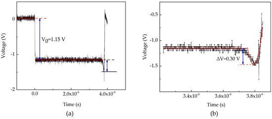 In the process of dynamic test, voltage signals were stored in the digital storage oscilloscope, as shown in Figure 11. The first horizontal line on the left side of Figure 11 is the voltage state of the sensor without power supply. The second horizontal line denotes the voltage state of the sensor when the constant current source provides the current. The following voltage change are attributable to the resistance change of the manganin sensitive element caused by detonation wave. The other voltage states are complicated and they may be the results of the multiple reflections of detonation wave or the damage of the sensor. The data processing only needs two previous changes of the voltage and the processed results are shown in Figure 12. The red lines are the fitting curves of experimental data. From Figure 12a,b, it can be seen that the initial voltage of the sensor is 1.15 V and voltage variation of the sensor is 0.30 V. Then we have P5 = 20.8696 GPa. Upon building the simultaneous equations of Equations (9), (10), (12), (13) and (15), substituting the known parameters into them, and solving for P1. Finally, we obtain the detonation pressure of micro-detonator is 12.66 GPa. From Figure 12b, we can know that the response time of the sensor is about 37 ns which is shorter than that of ordinary foil manganin sensors [15].