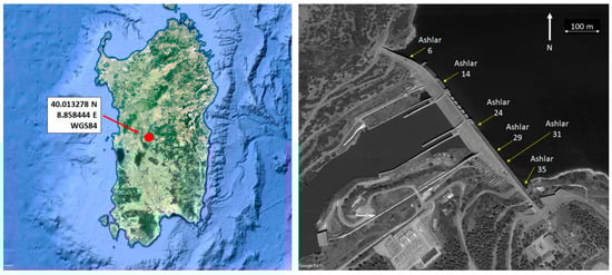 Geographical position of the Cantoniera dam in Sardinia (Italy), on the left: dam aerial view with indicated ashlar positions, on the right (credits Map data ©2015 Google).