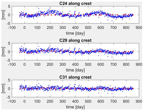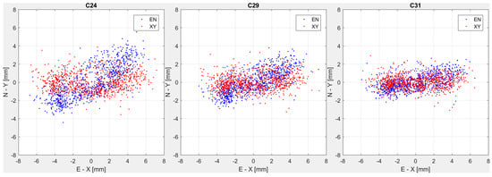 If these (N, E) coordinates are plotted for the three GNSS stations that are in correspondence with the three pendulum devices, placed at ashlars 24, 29 and 31 respectively, they result in clouds of points as it is represented in Figure 4 (blue dots). The three point clouds are roughly distributed as an ellipse having the two semi-axes with different magnitude and orientation, depending on the considered ashlar. Considering the same observation period, the studied part of the crest (left hydraulic side of the dam) does not move homogeneously. The displacements increase from the eastern dam edge to the center, in fact points are more dispersed for ashlar 24 that is the most central, while the opposite behavior is observed in ashlar 31, close to the constrained edge of the dam.