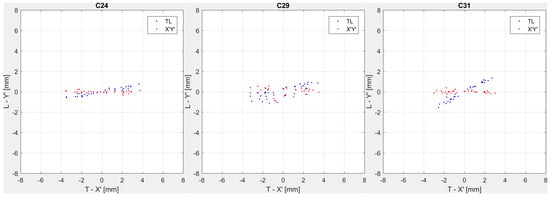 The (T-L) pendulum displacements in the 24, 29 and 31 ashlars are plotted in Figure 5 (blue dots). Also, in the case of pendulum data, the displacements highlight different behaviors in the different ashlars, so that the rotation between each T-L frame and the corresponding (X′,Y′) frame is different. Thus, again, it must be underlined that three different reference systems must be assumed also for the three pendulums. In order to align the (T,L)i=1,2,3 axes to the cross-crest and along-crest directions, a procedure similar to the one devised for the GNSS coordinates has been adopted.