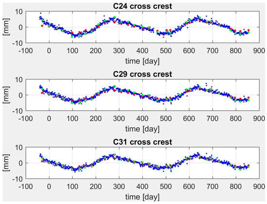 Displacements estimated on ashlars 24 (top), 29 (center), 31 (bottom) by pendulums (red dots) and GNSS (blue dots) in the cross-crest direction (green dots represent the collimator observations) from October 2014 to April 2017.