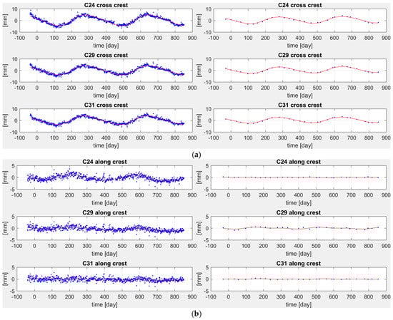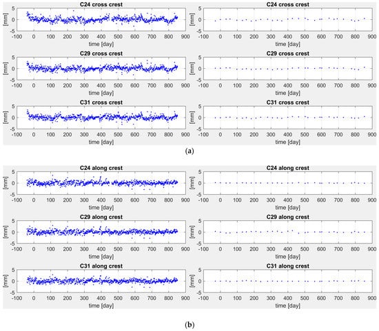 (a) Residuals of estimated models in the cross-crest direction by GNSS (left) and pendulums (right). (b) Residuals of the estimated models in the along-crest direction by GNSS (left) and pendulums (right).