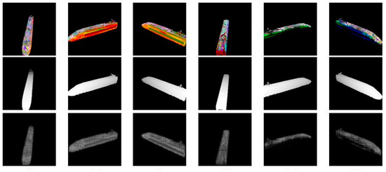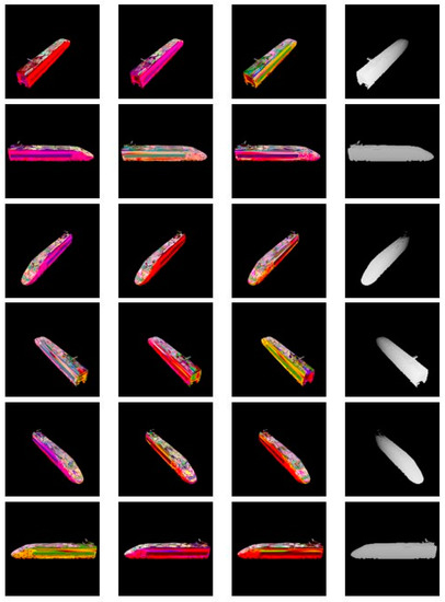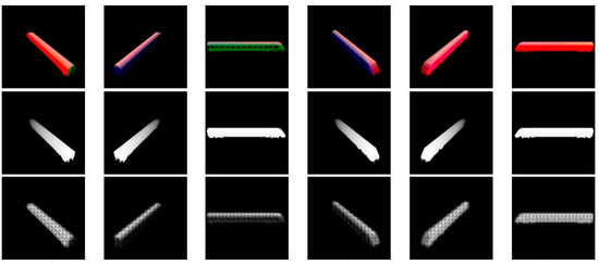 During the experiment, we fixed the camera at 12 different positions respectively and set the three light sources with 1320 different angle combinations. We obtained 15,840 rendered images of different colors with different angles. The size of each image is 600 × 600. At the same time, we also got the depth image corresponding to each image as the ground truth of the training network. We used 12,000 images as training data, and the remaining 3840 images as the test data. Some of the pseudo color images we generated used in the train model are shown in Figure 3. It should be noted that, because the depth data rendered is opposite to the actual meaning, the closer the position to the camera, the greater the brightness in the depth map.