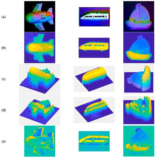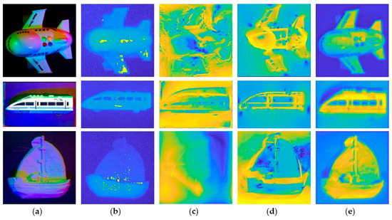 The final results produced by Matlab’s imagesc function. (a) The input images. (b) The outputs of Kinect. (c) The result of the depth estimation of traditional multi-spectral PS. (d) The result of [10]. (e) The result of the depth estimation of our method.