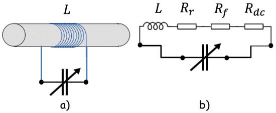 Illustration of (a) ferrite rod antenna, and (b) equivalent circuit of tuned ferrite rod antenna.