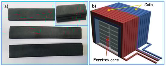 AM antennas based on ferrite cores increase significantly the radiation resistance Rr of the antenna. Therefore, placing the ferrite core in the coil has the effect of raising the radiation resistance by a factor of μ2, as you can see in Equation (1). Evidently, then the introduction of the ferrite core not only rises the radiation resistance but also reduces the losses due to the resistance of the coil. Moreover, one of the requirements for an efficient ferrite rod antenna is that it should have a Q bigger than 100 at the frequencies over which it operates. Thus, according to Equation (3), as Q increases Rls decreases, this reduces the loss resistance and hence the higher performance of the AM harvesting system. Besides, according to Equation (3) an alternative way to increase Q is by increasing L, in this sense a single core ferrite antenna could be inefficient because of its small cross section A. Thus, in the present work in order to enhance L via A as shown in Equation (4), a ferrite antenna made of a set of stacked planar ferrite cores has been developed. Figure 4a shows the single ferrite cores used for development of the ferrite antenna; the inset shows the stacked cores with the aim of increasing the L value of the coil.