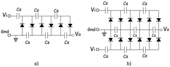 Besides, voltage multipliers are simple circuits made from diodes and capacitors that can increase the input voltage by two, three or n times to supply the desired DC voltage to a given load without the need for a heavy step-up transformer. Figure 5a shows the circuit for half-wave conventional CWVM. Theoretically, any desired amount voltage multiplication can be obtained and a cascade of “N” doublers, would produce an output voltage of V0 = 2 NVip, where N is the total number of stages and Vp the input peak voltage. Nevertheless, with many stages, stray shunt capacitances due to diode junction capacitance permit altering currents to flow in the series capacitances of each stage. In this sense, by increasing the number of stages, the output voltage also is increased. However, it has been previously demonstrated that diode junction capacitance conducts altering currents into stage capacitances, such as current lower output voltage; so there is an optimal number of stages which results in a maximum output power, and this number is around six stages as previously reported [5,12].