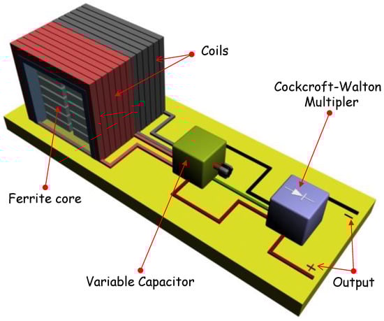 AM stations have some disadvantages compared to other RF sources; for instance, they are limited to transmit power well below 50 kW, and TV stations transmit power up to 1 MW in the USA Besides, due to the long wavelengths, tiny AM antennas broadly go through a very low performance. Nevertheless, despite all those constraints, the model of a high-sensitivity scavenger that is able to harvest very low intensity electromagnetic waves can be reached by designing a high efficiency AM antenna, as well as an optimized AC-DC converter, as it will be explained in the next sections. A detailed electrical circuit of the suggested RF harvester is shown in Figure 2. It is made of the high-Q AM resonator (LC tank circuit), the boost converter (CWVM), and the load which can be either a capacitor for energy storage or a low power consumption device.