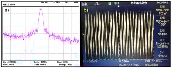 Figure 7a shows the detected RF spectrum; clearly, in the central part of the spectrum appears the 1 MHz signal. Based on this, the AM harvester has been tuned to 1 MHz. Figure 7b presents the signal detected by the resonant circuit; it can be observed a value of 1.5 Vpp at 1 MHz.
