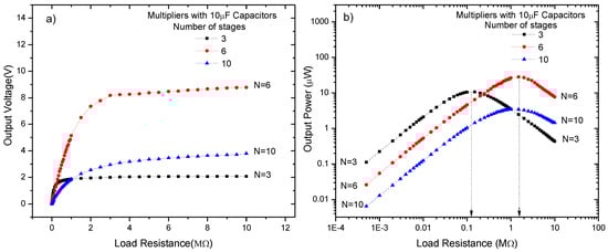 Figure 8a shows the output voltage vs the load resistance for a conventional CWVMs based on 10 μF stage capacitors, and with different number of stages, N = 3, 6 and 10. For all CWVMs it can be observed that as the number of stages increases no necessarily the output voltage increases; for instance, Vout (N = 6) ˃ Vout (N = 10). Moreover, Figure 8b shows the power delivered into the load resistance. Evidently, when Zout ≈ Rload, and N = 6, a maximum power is dissipated on the load resistance. Therefore, as the number of stages increases, the output impedance increases. Hence, by modifying N the output impedance of the system can be controlled according to the load.