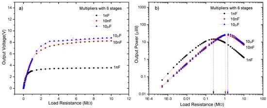 (a) Output voltage, and (b) output power vs the load resistance for a CWVM with N = 6 and with different stage capacitors. Detected input signal in LC resonator is 1.5 V at 1 MHz.