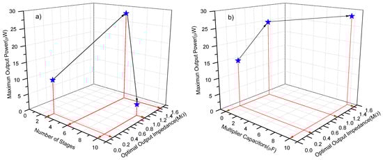 (a) Maximum output power vs the number of stages of the CWVM and load resistance, and (b) Maximum output power vs of the stage capacitors of the CWVM and load resistance.