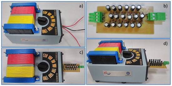 Figure 11a shows an image of the implemented AM-RF harvester system without CWVM. Such a prototype detects RF signals ranging from 540 KHz to 1700 KHz via the tuning capacitor, the signal detected is shown in Figure 7b, and it corresponds to a commercial AM station transmitting at 1000 KHz. The CWVM used in the present prototype is shown in Figure 11b, and it corresponds to a full-wave CWVM. As explained previously, the aim for using a full-wave CWVM is to get the double of the power from the RF signal. Based on the above discussion, in order to obtain the maximum power from the harvester a 6-stages/10 μF dc-dc CWVM with BAT85 rectifiers has been selected. Figure 11c,d show a top and lateral view respectively of the RF detector (AM resonator) and the CWVM once they have been integrated.