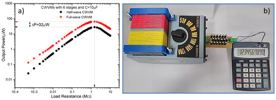 (a) Output power for a half-wave and full-wave CWVM, and (b) portable electronic calculator running with the AM energy harvester. Detected input signal in LC resonator is 1.5 V at 1 MHz.