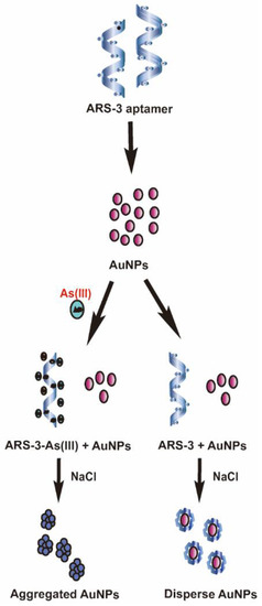 The principle of arsenic As3+ detection with AuNPs.