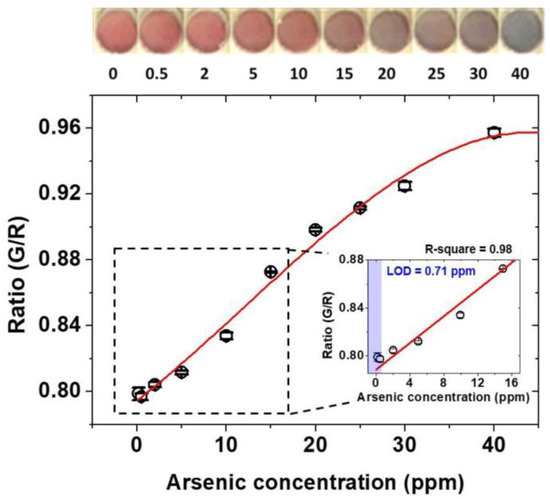 To assess the utility of the device for quantitative analysis of arsenic As(III) in the soil, the standard solutions with known concentrations of arsenic As(III) (0 ~ 40 ppm) are spiked in neutralized extractants having aptamer, AuNPs, and NaCl. The use of spiked soil samples is a general practice to assess the utility of the device on real soil [58]. The extract of spiked soil samples includes the other ion as well as the organic contaminants. The high coefficient of correlation is an indicative of a minimum interference of the organic and inorganic contaminants. All samples are assessed visually using smartphone device within ~30 min and tested with control samples to minimize the uncertainty in the results. Figure 5, shows the quantification of G/R intensity experimentally obtained with increased arsenic As(III) concentration along with the fitted standard curve. The standard curve was fitted with MATLAB software program (R2017a, MathWorks, Inc., Natick, MA, USA). The intensity increases with the increase in the arsenic concentration and shows the saturation point beyond the 40 ppm arsenic. Inset photographs show the color change of the assay for each case. As the arsenic concentration is getting higher, overall color is shifted from red to grey, indicating the increased aggregation of AuNPs in the presence of arsenic As(III). The color remained red near 0.5 ppm because the amount of arsenic As(III) is not sufficient to break the electrostatic interaction between aptamer and AuNPs. The limit of detection (LOD) is calculated by taking the ratio of standard deviation of control samples () (samples without arsenic), over the sensitivity, or the slope of the standard curve at a low arsenic concentration (). The inset graph shows a linear response in the range of 0~15 ppm with the coefficient of determination of 0.99177 (R-square). The coefficient of determination was calculated with the functions in Curve Fitting Tool box in MATLAB. The resulting LOD of As(III) in the sample is measured to be 0.71 ppm. Reproducibility of the experiment is confirmed by the repetition in five times, which can be depicted from corresponding error bars with each black empty circle in the graph. The overall results demonstrate the accuracy of the protocol to detect the arsenic As(III) with LOD less than the USEPA recommended a limit of arsenic As(III) in the soil.