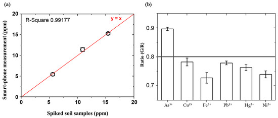 (a) Comparison of smartphone-based measurement with the standard method (ICP-MS) for arsenic As(III) spiked soil samples at different concentrations; (b) Specificity test for arsenic As(III) against other heavy metal ions at the same concentration (20 ppm). Each column related to the standard deviation (error bars) of three repeated experiments.