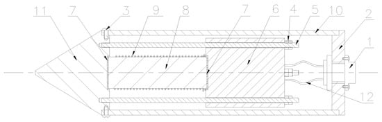 Structural diagram of the GMS ultrasonic actuator. (1) Plug seat; (2) Rear cover; (3) Screw; (4) Nut; (5) Pre-tension screws; (6) Cylindrical steel mass; (7) Backing gasket; (8) GMS rod; (9) Magnetic exciting coil; (10) Outer cover; (11) Energy-focusing head; (12) Wire to drive the circuit.