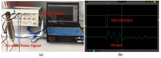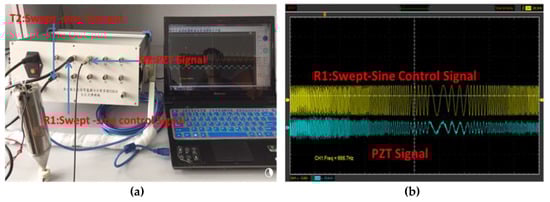 The setup for pulse signal transmission and reception is shown in Figure 6a, and the corresponding waveforms are shown in Figure 6b. The transmitted pulse is a 50 μs square pulse. The received wave shows several reflections of the pulse. Figure 7a shows the setup for the sweep sine signal transmission and reception, and the corresponding waveforms are shown in Figure 7b. The tested scanning signal has a frequency range of 300 Hz–40 kHz, considering the limitation of the amplifier (10 Hz–150 kHz). The correlation coefficient between the transmitted signal and the received signal is 88.7%; therefore, there is a good correlation between the transmitted signal and the received signal.