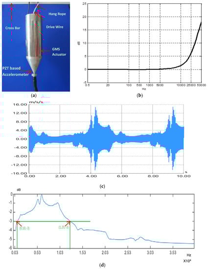 The experimental results shown in Figure 8b validate that the GMS actuator is able to generate a sweep signal. To obtain the frequency response of the GMS actuator accurately, a new experiment was performed. As shown in Figure 8a, the GMS actuator was hung in the air, and a PZT-based accelerometer with a better low-frequency response was used as a sensor, instead of the smart aggregate described in Section 4.1, to more accurately test the low-frequency characteristics of the GMS actuator. The PZT-based accelerometer integrates a traditional piezoelectric accelerometer with a charge amplifier to ensure better noise immunity. The PZT-based accelerometer has a sensitivity of 20.21 mV/(m·s2). The frequency response of the PZT-based accelerometer is shown in Figure 8b. The sweep signal was a 300 Hz–40 kHz signal with a duration of 5 s. Figure 8c shows the received sweep signal. Analyzing the power spectrum of the received signal and excluding the frequency response from the PZT sensor reveals the frequency response of the GMS actuator, as shown in Figure 8d. It is clear that the frequency range for –3dB is 1–12.5 kHz. The performance of the GMS actuator at low-frequency actuation is better than that of a PZT transducer [], which makes it more suitable for large area inspections.