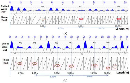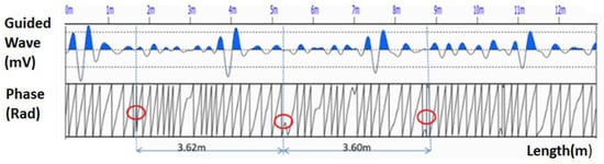 Once the full length of the rock bolt is obtained, the defects can be identified as the locations that are at points shorter than the full length. As an example, the received waveform and the instant phase of specimen no. 1 are shown in Figure 11a. The sudden change in the instant phase is marked by the red circle. According to Equation (4), the locations of the instant phase change are: , , . Since (), the change of the instant phase is periodic. Therefore, the length of the rock bolt is