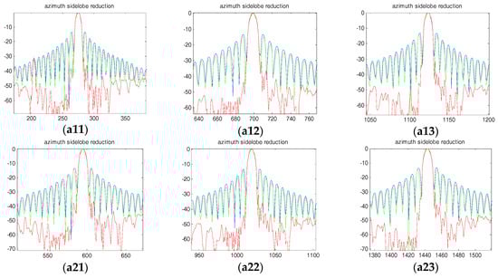Figure 11 and Figure 12 show the range and azimuth profiles of the nine point targets. The blue line corresponds to the original result of the squint SAR image (Figure 8), the green line is the result processed by the traditional SVA (Figure 9), and the red line is the result processed by the proposed framework (Figure 10). It is apparent that the traditional SVA algorithm is ineffective for squint SAR image sidelobe reduction while the proposed framework can suppress sidelobes well and keep the resolution at the same time.