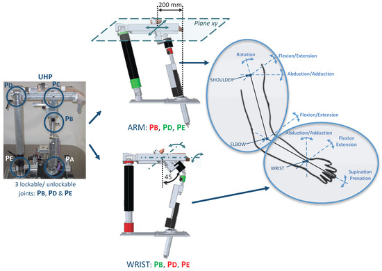 The UHP robotic device is a multifunctional upper limb rehabilitation robot designed for the treatment of people with reduced mobility due to stroke [24]. Thanks to the use of three lockable/unlockable joints (, and ), the UHP has the ability to configure its mechanical structure (Figure 1). This reconfigurable structure allows to define eight operating modes. However, for the case of study analyzed in this work, two of the most used will be detailed: ARM and WRIST modes [25].
