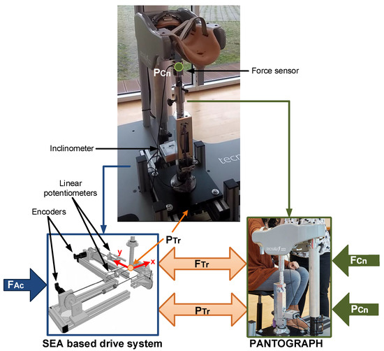 The aim of the virtual sensors is to provide an accurate feedback of the robot/patient interaction, this is, to provide estimations of the force () and motion () of the contact point between the robot and the patient. For that purpose, the proposed approach is based on the mathematical model of the UHP rehabilitation robot and the motion measurements provided by the SEA drive system of the robot ().