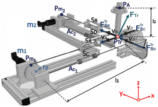 The UHP rehabilitation robot is divided into two subsystems: a pantograph-based robotic device and a drive system based on elastic components (Figure 2). The pantograph structure interacts with the patient at the contact point (), while the drive system provides the force/motion to the robotic device by means of two ortogonally placed Serial Elastic Actuators (SEA) [28]. Each SEA actuator is composed of a rotary motor and two linear springs connected by rigid cables, as shown in Figure 2. Hence, the motion of the drive system based on elastic components () is generated by the rotative motions of the motors () and the variable length of the springs (). The two subsystems are connected in a single transmission point ().