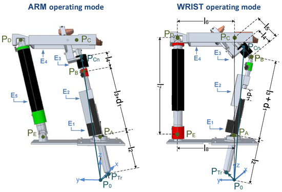 Equation (6) depends on the mechanical configuration of the pantograph structure, this is, on the particular operating mode (ARM or WRIST) selected (Figure 4).