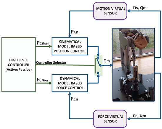 In order to validate the developed Virtual Sensors, they were integrated into an advanced position/force controller designed for the UHP rehabilitation robot and their performance was evaluated by performing active and passive rehabilitation exercises. The integrated controller is composed by a set of controllers that operate at two levels. In the low level, two controllers operate in parallel: a kinematical model-based position control and a dynamical model-based force control. The high level controller, which defines the rehabilitation task (active or passive), is used to select the force or position controller and their reference. The overall structure of the controller is summarized in Figure 5.