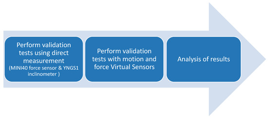 To evaluate the applicability and reliability of the Virtual Sensor approach, the control performance of the robot based on the proposed Virtual Sensors has been compared with that using actual high accuracy sensors in different experimental tests. For that purpose, a three step procedure has been followed for the validation, as shown in Figure 6: (1) Each experimental test has been carried out with the rehabilitation robot, where the required low level controllers have been fed with the data provided by high accuracy sensors that measure and ; (2) the same test has been performed using controllers whose data feedback data is provided by the proposed Virtual Sensors; (3) the results of both approaches have been compared . In the first step, A MINI40 force/torque sensor (ATI, , N resolution) has been used to measure , while the precise YNGS1 inclinometer (Sensor-Technik Wiedemann GmbH, , 0.25°/s resolution) has been adopted for the measurement of .