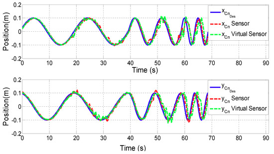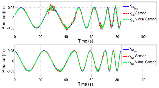Figure 7 and Figure 8 show the results of the contact point displacement for ARM and WRIST operating modes, respectively. In the upper plot, the x coordinate of is shown, while the lower one represents the y coordinate. In addition, the blue line illustrates the reference motion of the contact point (), while the red line is associated to the case using additional sensors, and the green one to the case in which the proposed Motion Virtual Sensor is used. Table 1 summarizes mean and maximum distance error for both cases.