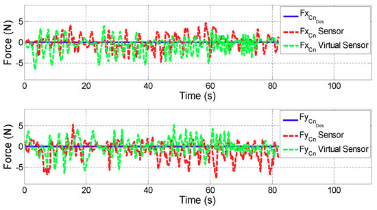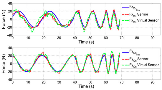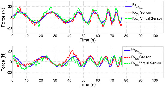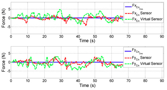 For all the figures in this section, the upper plot depicts the evolution of the x coordinate of the contact force () while the lower one shows in y coordinate. In addition, the blue line defines the desired contact force (), the red line is related to the contact force provided by the controller with real sensors (), while the green one corresponds to the case in which the Virtual Sensor () is used.