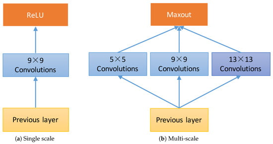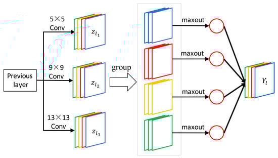 As shown in Figure 3, the multi-scale convolutional layer includes types of filter and . Suppose that each filter bank contains , and the convolutional output is 12 feature maps divided into 4 groups, the maxout function performs maximum element-wise pooling across these 4 groups of feature maps. In each iteration during the training procedure, the convolutional layer feeds feature maps into the maxout activation function, whereas the activation function ensures that the units that have the maximum values in the group are activated. The final output is 4 feature maps. Specifically, we denote the multi-scale convolutional layer as {5,9,13} when and .