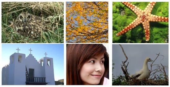 - Martin, D.; Fowlkes, C.; Tal, D.; Malik, J. A database of human segmented natural images and its application to evaluating segmentation algorithms and measuring ecological statistics. In Proceedings of the IEEE International Conference on Computer Vision, Vancouver, BC, Canada, 7–14 July 2001; pp. 416–423. [Google Scholar]