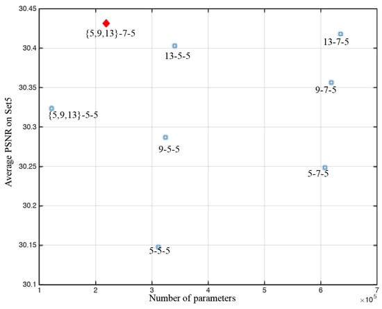 Different filter size and performance on Set5 with upscaling factor 4. The proposed method achieve trade-offs between performance and parameter sizes.