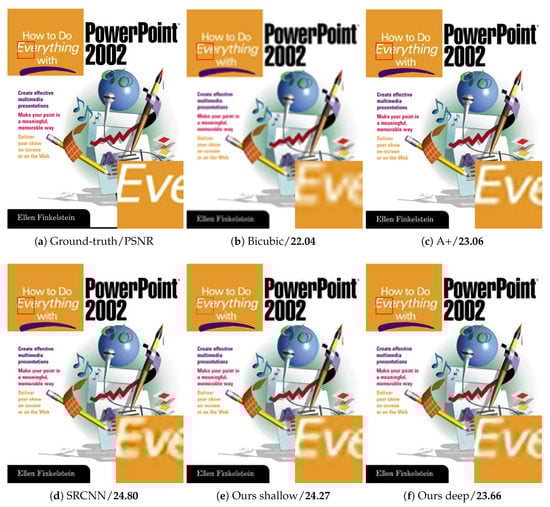 As shown in Table 6, our method surpasses SRCNN largely on “Butterfly”, “Woman”, “Bird” and “Monarch”, which have rich image details and diverse image features. For images with a large smooth region or repetitive texture pattern, such as “Baby”, “PPT3” and “Barbara”, the PSNR of our method is lower than that of the other methods. By stacking more multi-scale competitive module, the network provides more various size context for image reconstruction. Table 6 illustrates the better performance of our deep network than our shallow one. Figure 7, Figure 8, Figure 9 and Figure 10 present some sampled results generated by the compared methods. The HR images restored by the proposed method are perceptually more plausible with relatively sharp edges and few artifacts.