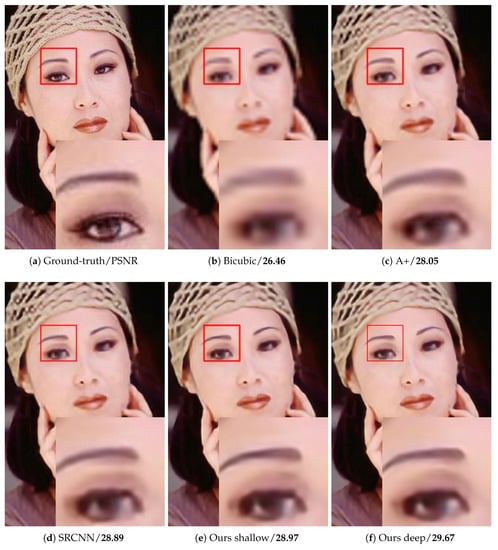 To evaluate our approach, we adopt the peak signal-to-noise ratio (PSNR) and the structural similarity (SSIM) index as evaluation criteria. The benchmark database includes Set5 and Set14 from []. The two datasets consist of different types of images; some images include repetitive patterns, such as the face of “Baby” and the tablecloth of “Barbara”, whereas some contain rich structural information, such as “Bird” and “Butterfly”.