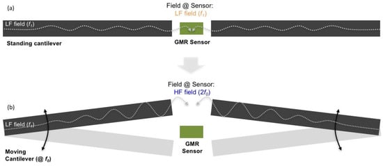 Simplified schematics of the device (side view) (a) in a standby position or (b) when cantilevers are moving. The cantilevers mechanical movement induces an AC magnetic field at the GMR sensor region. The field is detected at high frequency, where the sensor is not limited by 1/f noise.