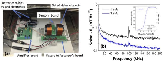 (a) Measurement set up used to perform GMR noise measurements; (b) Noise spectrum in magnetic units, nT/Hz1/2, for different biasing currents in the GMR sensor. The inset shows a GMR sensor transfer curve characterized in the final released device, showing a field sensitivity of 29 V/T when biased at I = 3 mA.