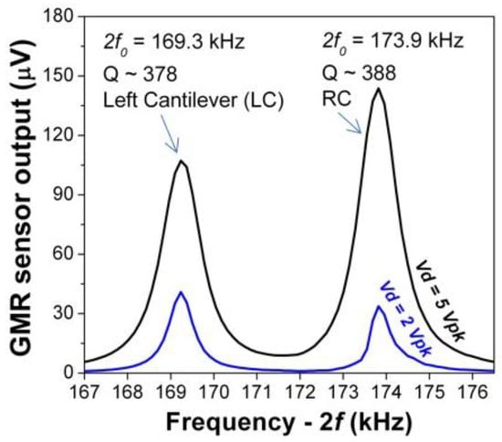 The resonance frequency of the cantilevers was measured by monitoring the GMR output in a presence of a small magnetic field while sweeping the excitation frequency of the MEMS cantilevers. The GMR output is maximized at the resonance of the cantilever by its mechanical Q—factor since the magnetic field modulation depends on the total displacement of the cantilever. Figure 3 shows the resonance frequencies for the left (LC) and right (RC) cantilevers detected by the GMR sensor. The signal was acquired with a lock-in amplifier by sweeping the frequency from f = 83 kHz to f = 89 kHz and reading the GMR output at 2f. It is possible to observe that the resonance frequencies for both cantilevers are slightly offset. This fact was attributed to a dispersion of DRIE micro-fabrication step during the backside release of the cantilevers. In order to achieve the highest field modulation efficiency out of the cantilevers, both LC and RC were driven at the resonance of the RC (2f0 = 173.9 kHz). To compensate for the low displacement occurring when excited off resonance the LC was driven at very high voltage (Vd = 160 V).