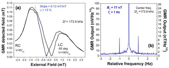 In order to measure the modulation efficiency (α), the external magnetic field was swept using a small set of Helmholtz coils. Figure 4a shows the resulting hysteresis loop, where α can be extracted by the slope of the curve. α was found to be 13% for this particular device. This value enables the calculation of the sensitivity of the final hybrid device, using Equation (2), which was found to be 950 pT/Hz1/2. The power consumption of the device was largely dominated by the GMR element and calculated to be 3.8 mW. In order to test the performance of the device in the detection of low frequency magnetic fields, the set of Helmholtz coils was used to produce a low amplitude field B1 at frequency f1 = 1 Hz and test the modulation and response of the device. The resulting signal is monitored by recording the sidebands 2f0 ± f1 with the GMR sensor. The minimum field detectable with our setup was 17 nT, which was successfully measured by our device, and is plotted in Figure 4b. As observed in Figure 4b, the detection peak amplitude is approximately 1/2 the external applied field.