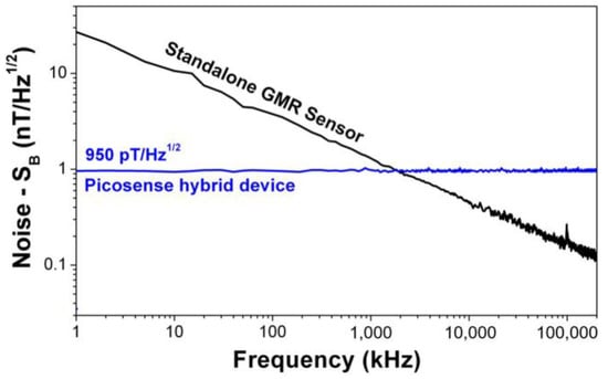 Figure 5 compares the noise spectrum of a standalone GMR sensor (without MFC elements and MEMS cantilevers) and Picosense’s hybrid sensor. The standalone GMR sensor is clearly affected by the 1/f noise, with the greatest impact observed at low frequencies. The hybrid device developed by Picosense operates at the modulation frequency 2f0 (hundreds of kHz), therefore the 1/f noise is negligible being the noise of the hybrid device solely limited by modulation efficiency of the cantilevers and the GMR sensor thermal noise at 2f0. At 1 Hz, Picosense’s hybrid device is >10× more sensitive than a standalone GMR sensor. The GMR sensor alone would not be able to detect the 17 nT magnetic field at 1 Hz, described in Figure 4b. This clearly validates Picosense’s modulation technique and the extremely good low frequency sensitivity of the device.
