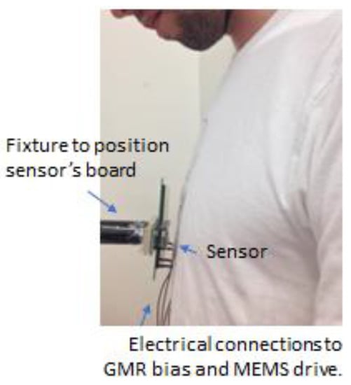 Apparatus used for contactless sensing of the subject heart-rate. The small magnetic sensor die is visible mounted on a chip carrier (sensor’s board). Distance between the sensor and the chest was approximately 1 cm.
